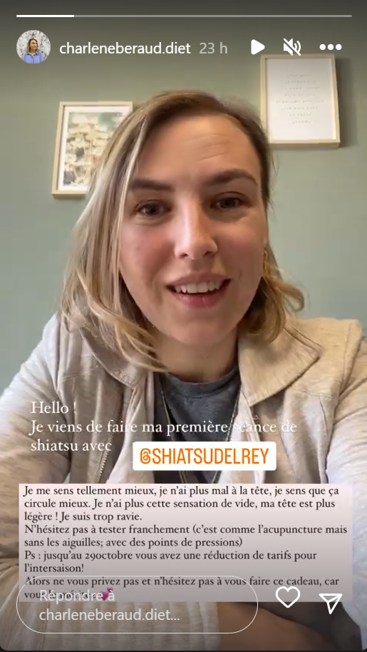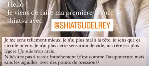 « Hello, j’espère que vous allez bien. Je fais cette petite story pour vous parler du Shiatsu. Je viens de faire ma première séance [… ] C’est vraiment une très bonne expérience. Le Shiatsu c’est comme de l’acupuncture mais au lieu des aiguilles, c’est des points de pressions. Et vraiment ça fait beaucoup de bien. J’avais une énorme barre à la tête qui ne passait plus […] je m’en sens vraiment libérée maintenant, j’ai plus d’énergie, je sens que ça circule mieux, je n’ai plus mal à ma tête, je me sens vraiment mieux […] »