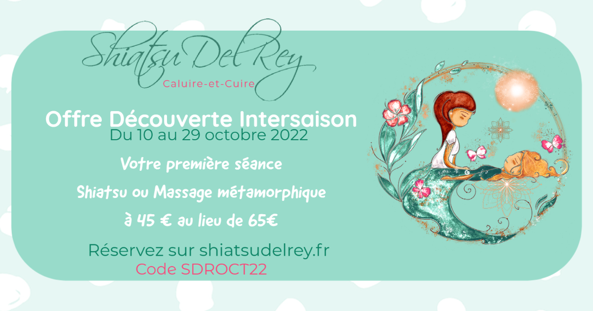 Du 10 octobre 2022 au 29 octobre 2022, je vous propose votre première séance de Shiatsu sur futon ou de Massage Métamorphique à 45 € au lieu de 65 € !